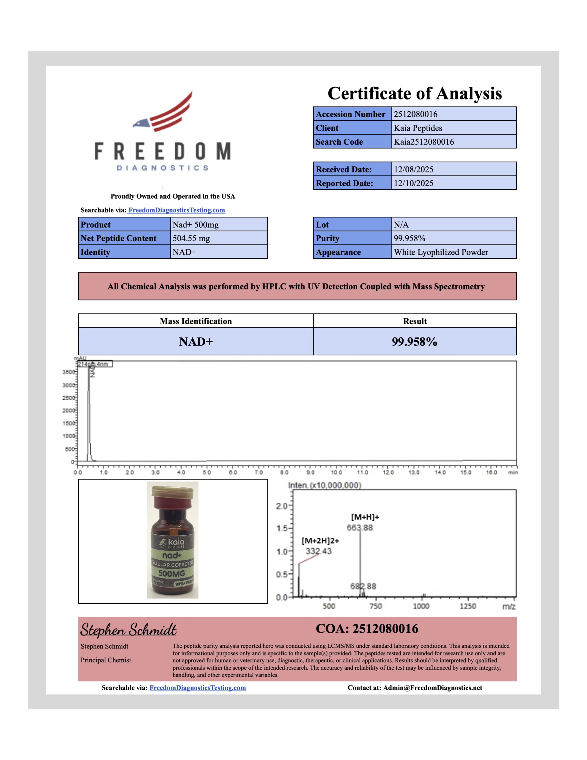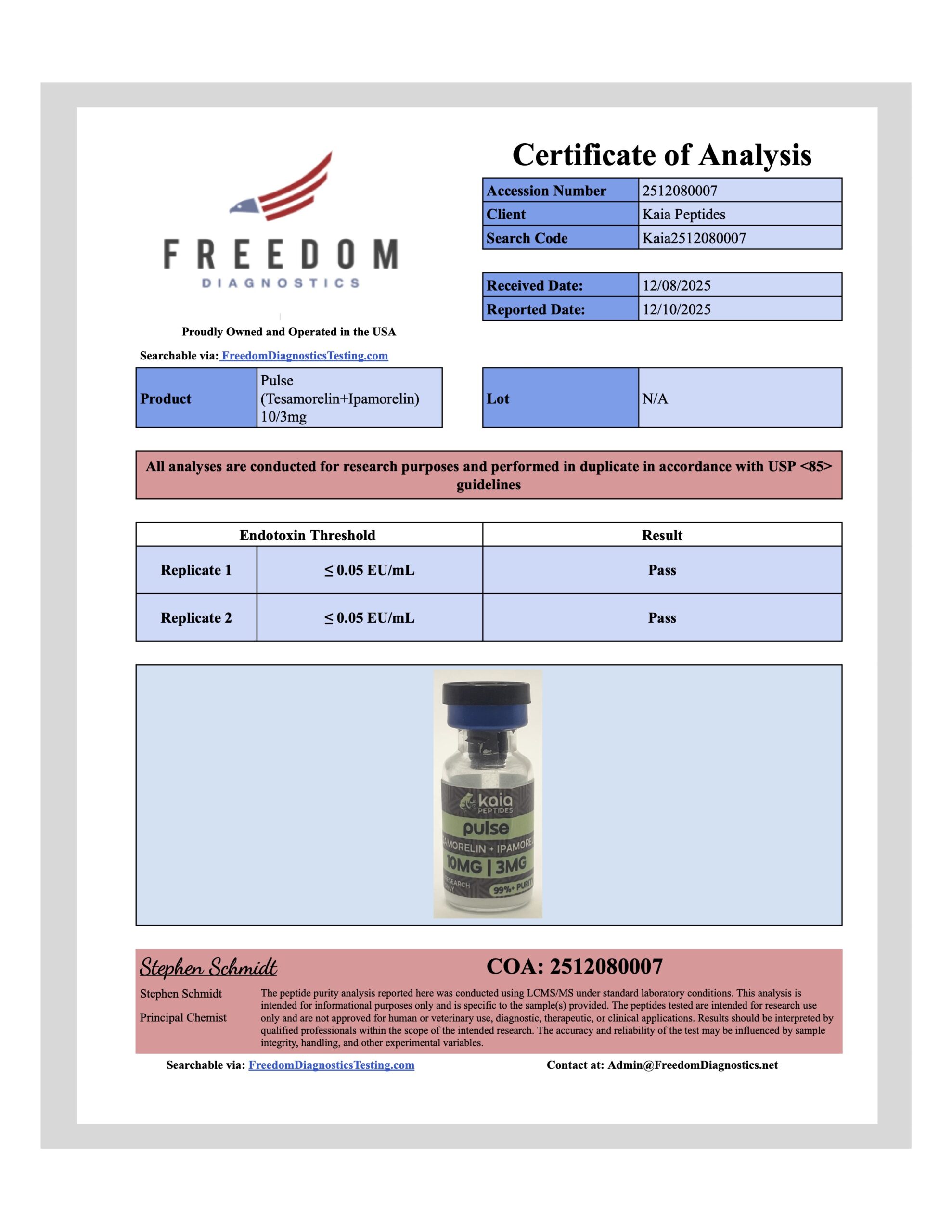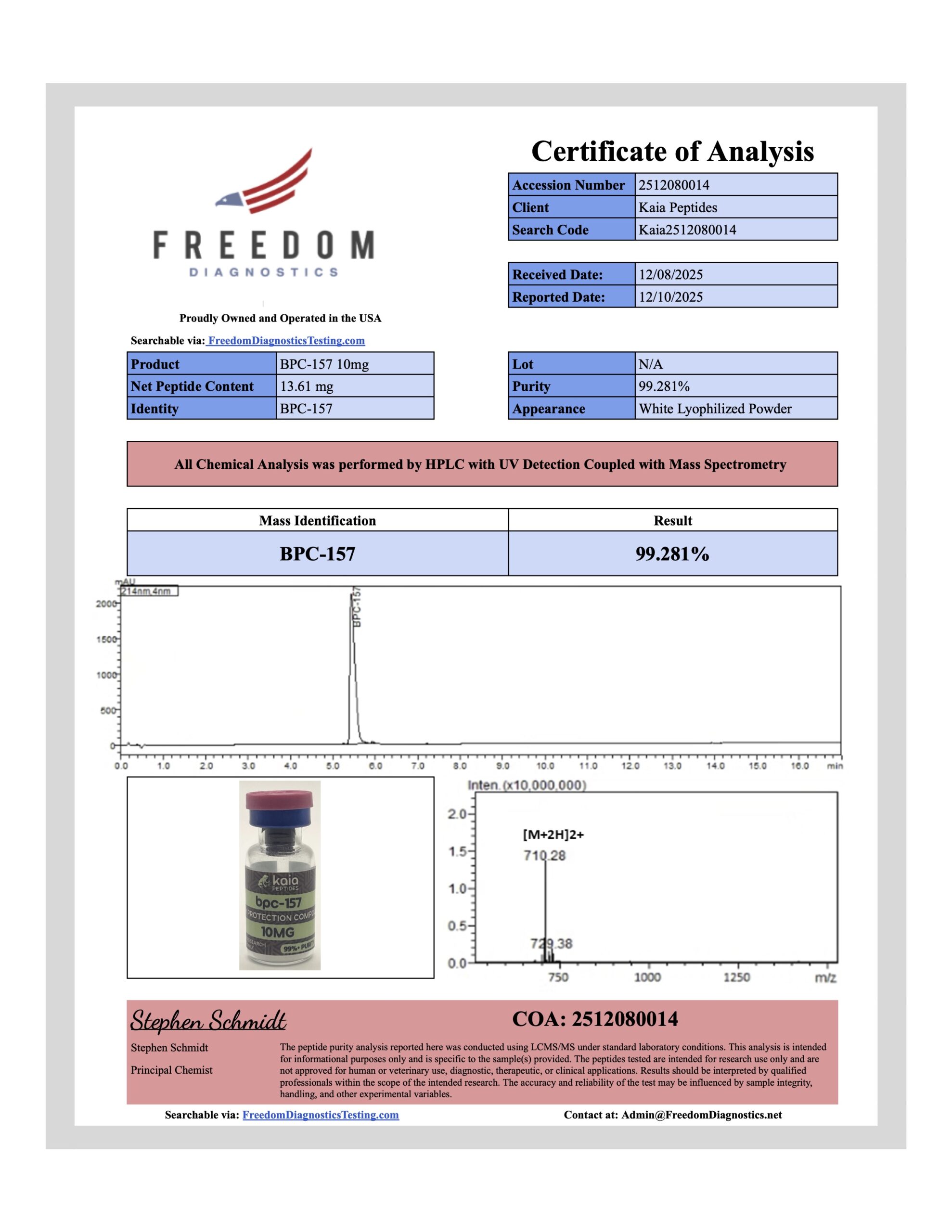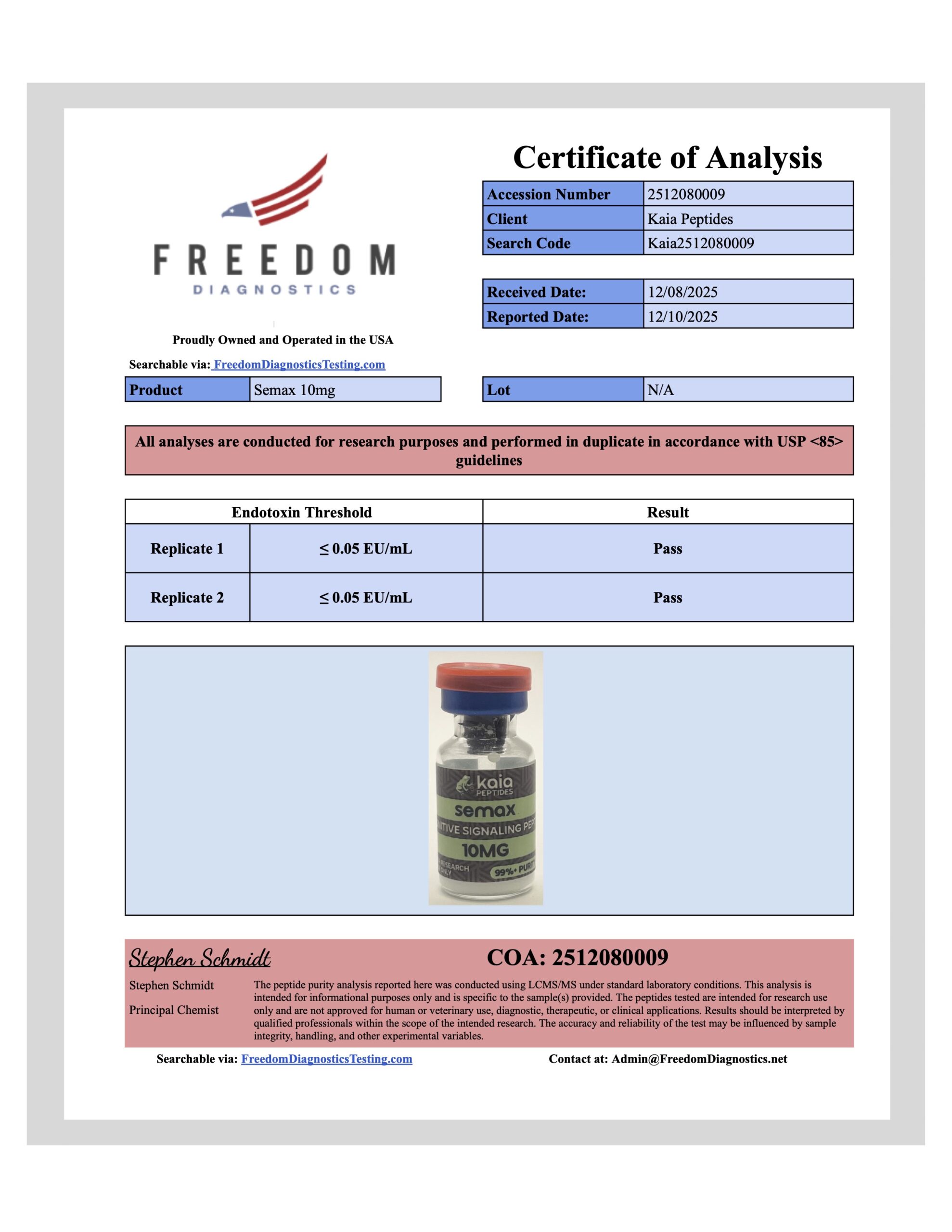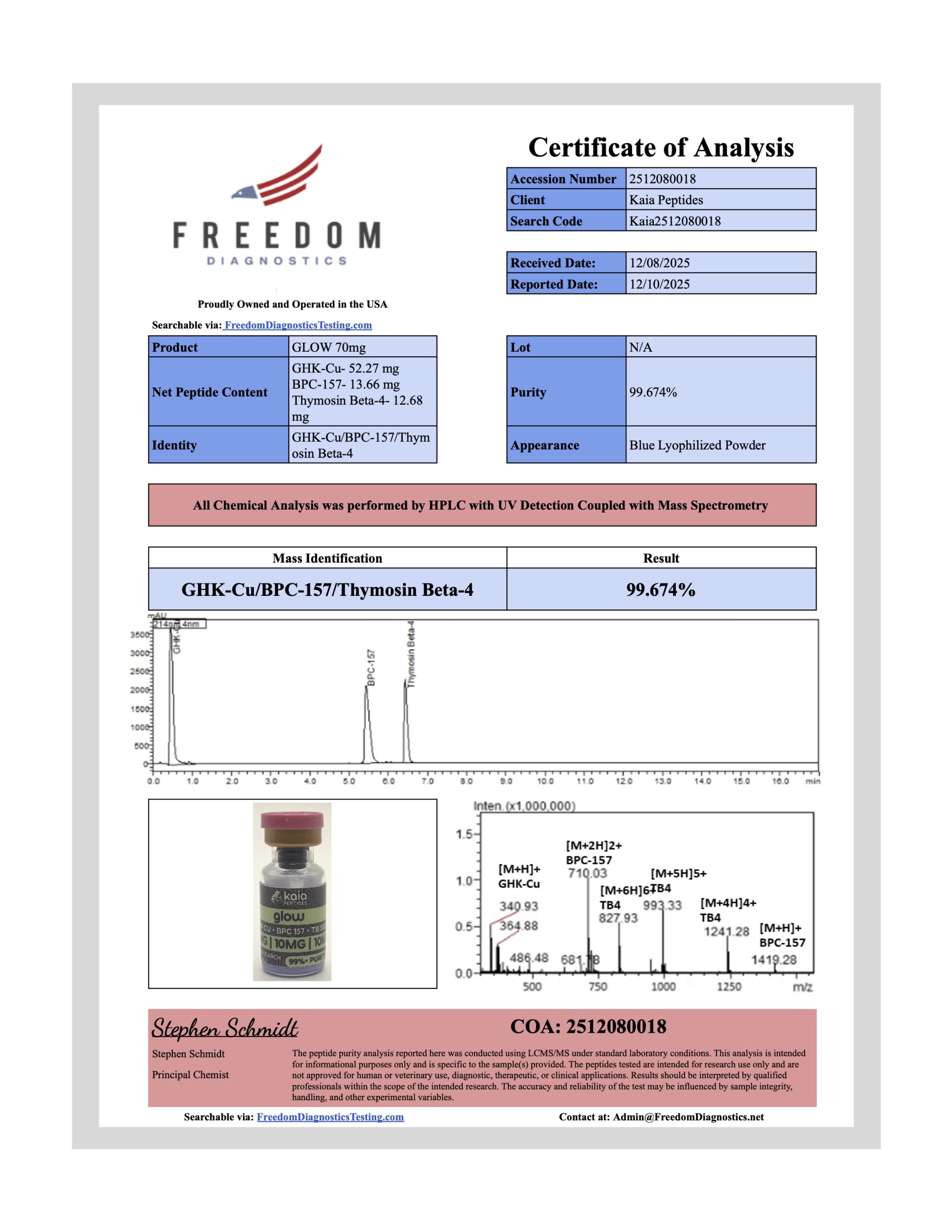 All Kaia Peptides undergo independent third-party testing through an American based lab called Freedom Diagnostics, located in Tennessee, ensuring verified purity, identity, and research-grade quality. Below you’ll find the full COA library for every peptide we offer, updated regularly to maintain transparency and scientific integrity.